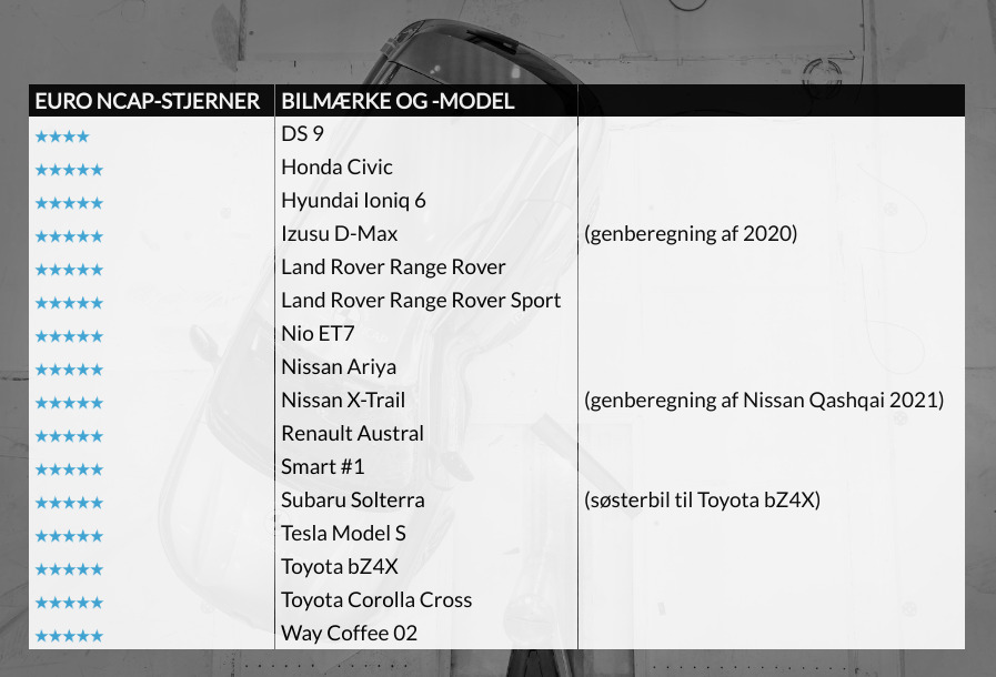Blandt testpuljens biler er der flere, der ligner ’danskerbiler’. Det gælder f.eks. elbilerne Nissan Ariya, Hyundai Ioniq 6, Toyota bZ4X og hybridbilen Toyota Corolla Cross. Alle fire opnår de eftertragtede fem stjerner.