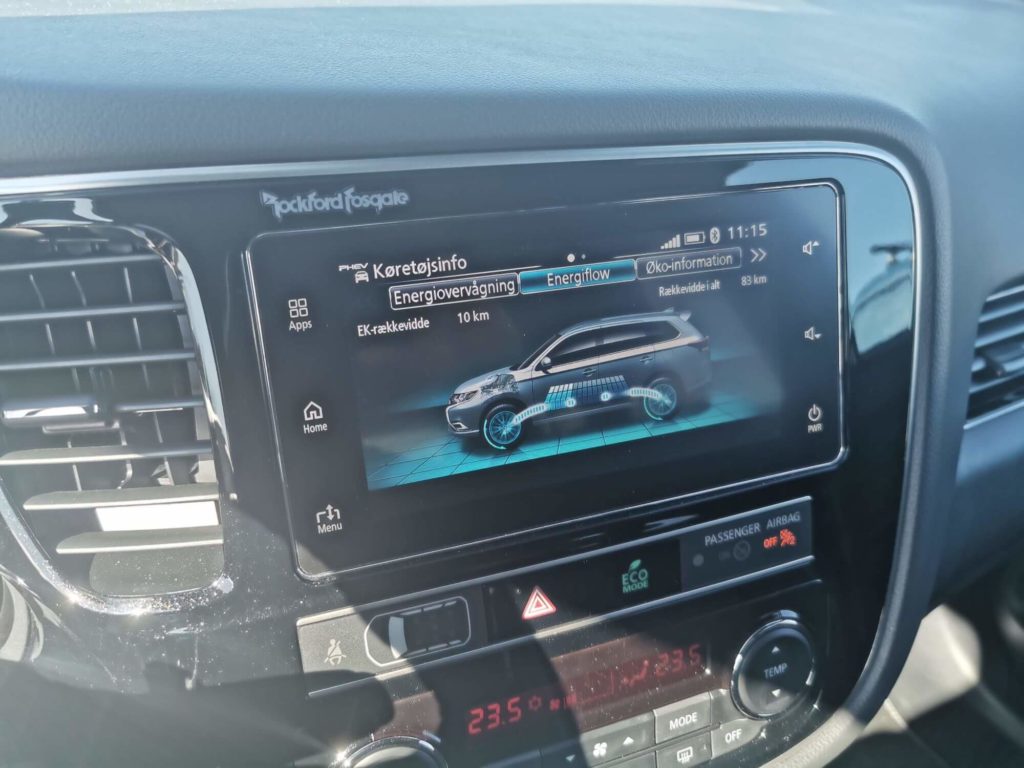 På infotainmentskærmen, som virker lidt for lille til bilen, kan man se, hvordan ens køremønster er. Mit viser, at jeg har kørt omkring 16 km/l. Det er ganske fint i så stor i en bil, men det er samtidigt langt fra de 50 km, Mitsubishi lover under absolut optimale forhold. Dem nåede vi ikke at få, og det er også ok.