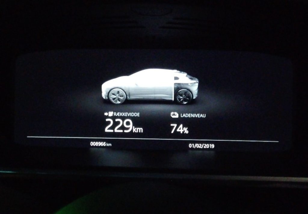 Vi hentede bilen en fredag morgen hos Jaguar og LandRover i Birkerød. Bilen var klar og fuldt opladet, og det betød ifølge Jaguarens system en rækkevidde på 384 km. et er allerede mindre end oplyst fra Jaguar, men det samme sker jo i andre biler. Er bilen kørt aggressivt på forhånd, så viser rækkeviddetælleren noget mindre end det optimale. Intet sært i det.