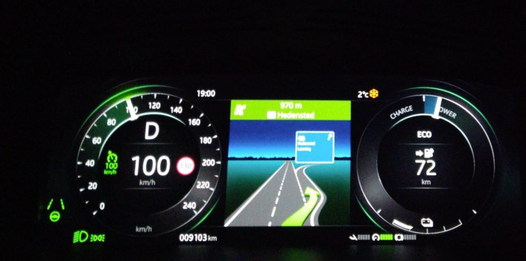 Knap 48 kørte km., nogle timer og et par ærinder senere, var vi klar til afgang mod Aarhus. Kl. 15.15 kørte vi fra Fælledparken i den centrale København. Rækkevidden sagde nu 290 km., selvom vi kun havde kørt knap 50 km. – heraf 35 km. bykørsel. Det var midt i myldretiden, og det betød da også, at vejene var fyldt med biler. Kø overalt. Derfor gik turen i den nu fyldte bil med et par børn på bagsædet gennem småveje, indtil vi knap 25 km. senere nåede ud på Køge Bugt-motorvejen i bilens lækre lædersæder, som giver god støtte til alle passagerer. Vi var i øvrigt også overraskende over, hvor god plads der var på både bagsædet og i bagagerummet (fine 650 l.).